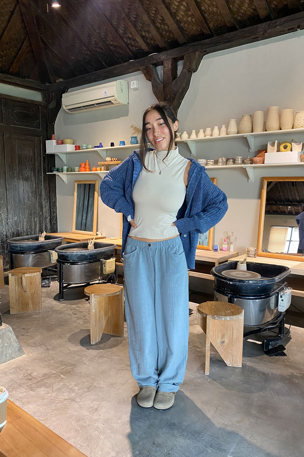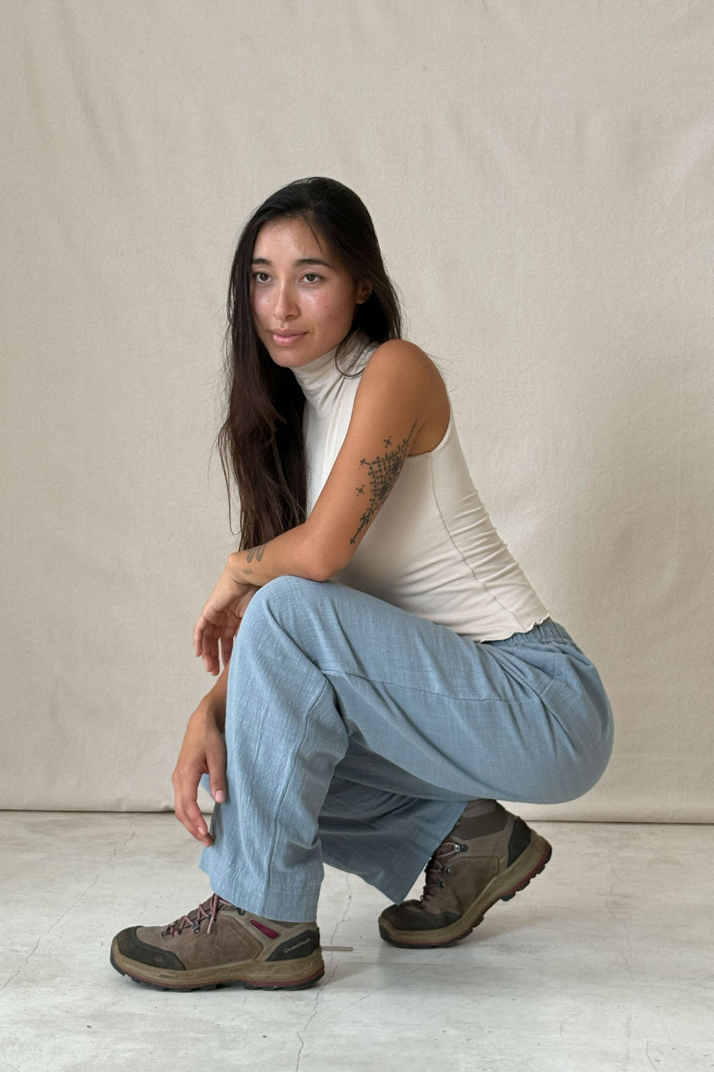When Hitomi approached us with the inspiration to create a collection that blended both masculinity and femininity, we knew we would need to dream up the perfect pants. We wanted to create a pair of pants that could be worn throughout Hitomi’s entire day – that she could wear to the art studio, get a little messy, and feel comfortable while in her creative flow. Finally, after many moons, the Devotion Pant was born.