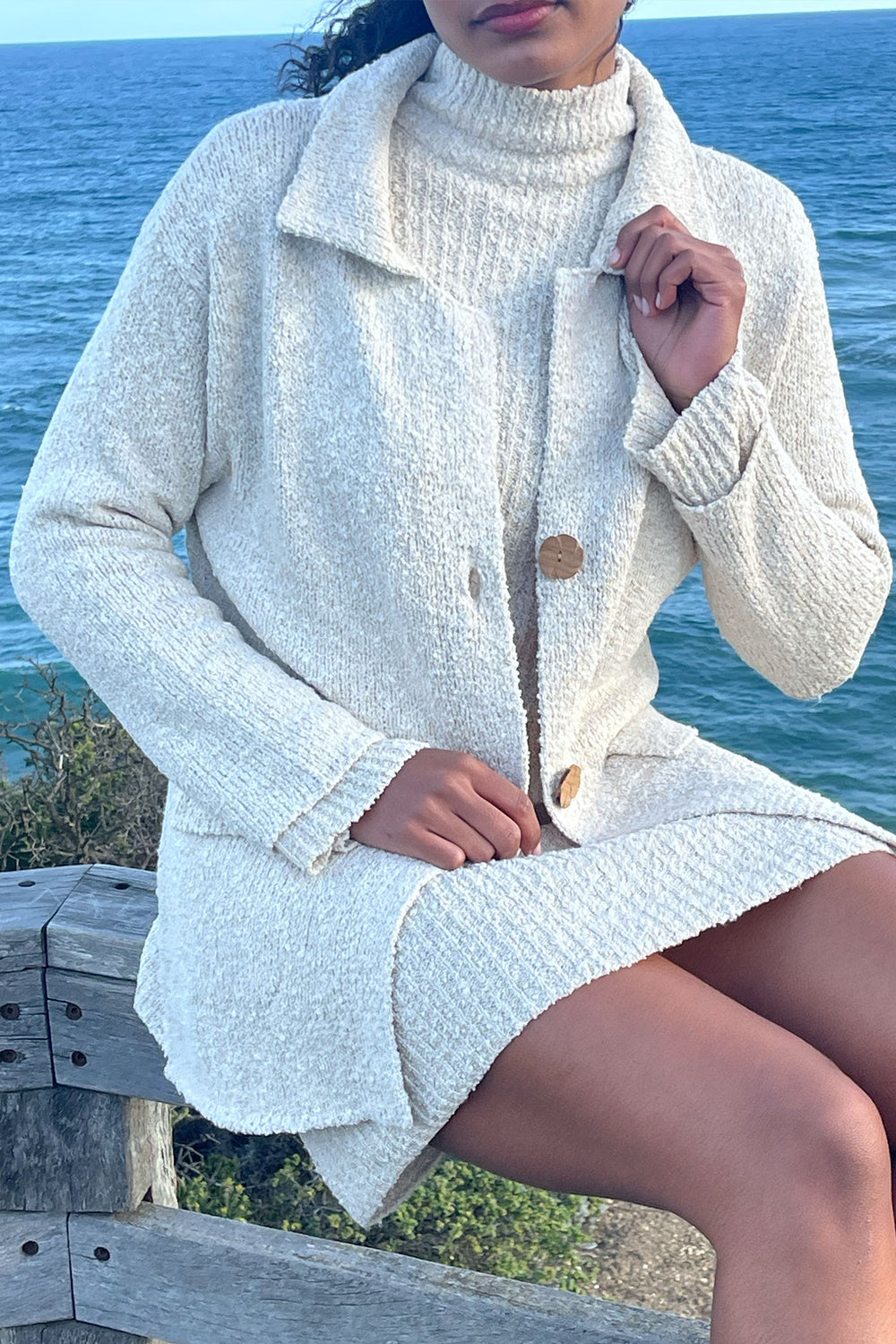 Our Olivia Jacket is here to hold you whenever you need a little extra warmth. Wear it buttoned up for a sophisticated look when the weather is chilly, or leave it open for a relaxed, breezy feel on warmer days. The wide collar and lapel detail give it a softly tailored look, while the hand-made wooden frangipani buttons add a touch of artisanal charm. We designed this one to move with you through the seasons.