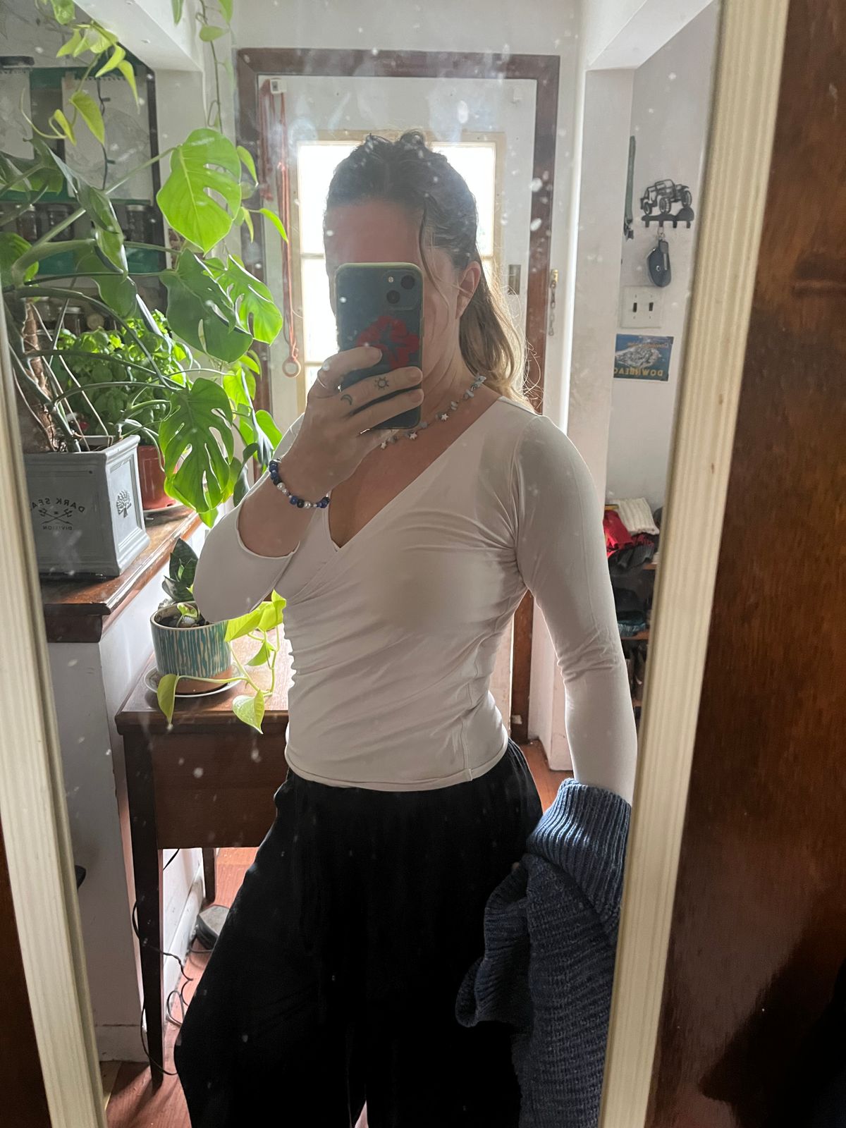 I now have this top in every color it is so pretty and easy to wear, goes with everything. Def size up.