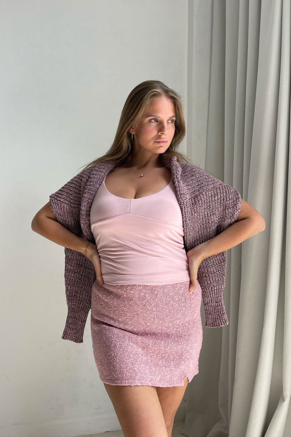 Introducing the Paloma Mini Skirt. This knitted mini skirt is an essential addition to your wardrobe, designed to feel comfortable while accentuating your curves. The soft elastic waistband provides a perfect fit, adapting to your body’s changes. The small front slit adds a unique touch, setting this skirt apart from others. Pair it with the Paloma Longsleeve for a coordinated look or style it with other Indigo Luna pieces. Available in Cloud Cream, Peony and Truffle, this skirt is a versatile must-have.