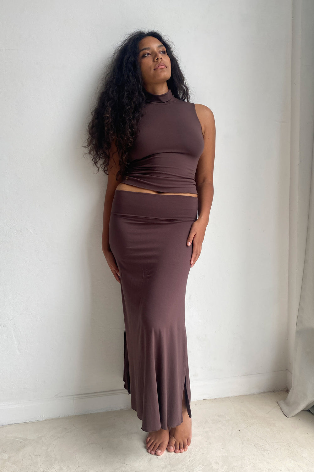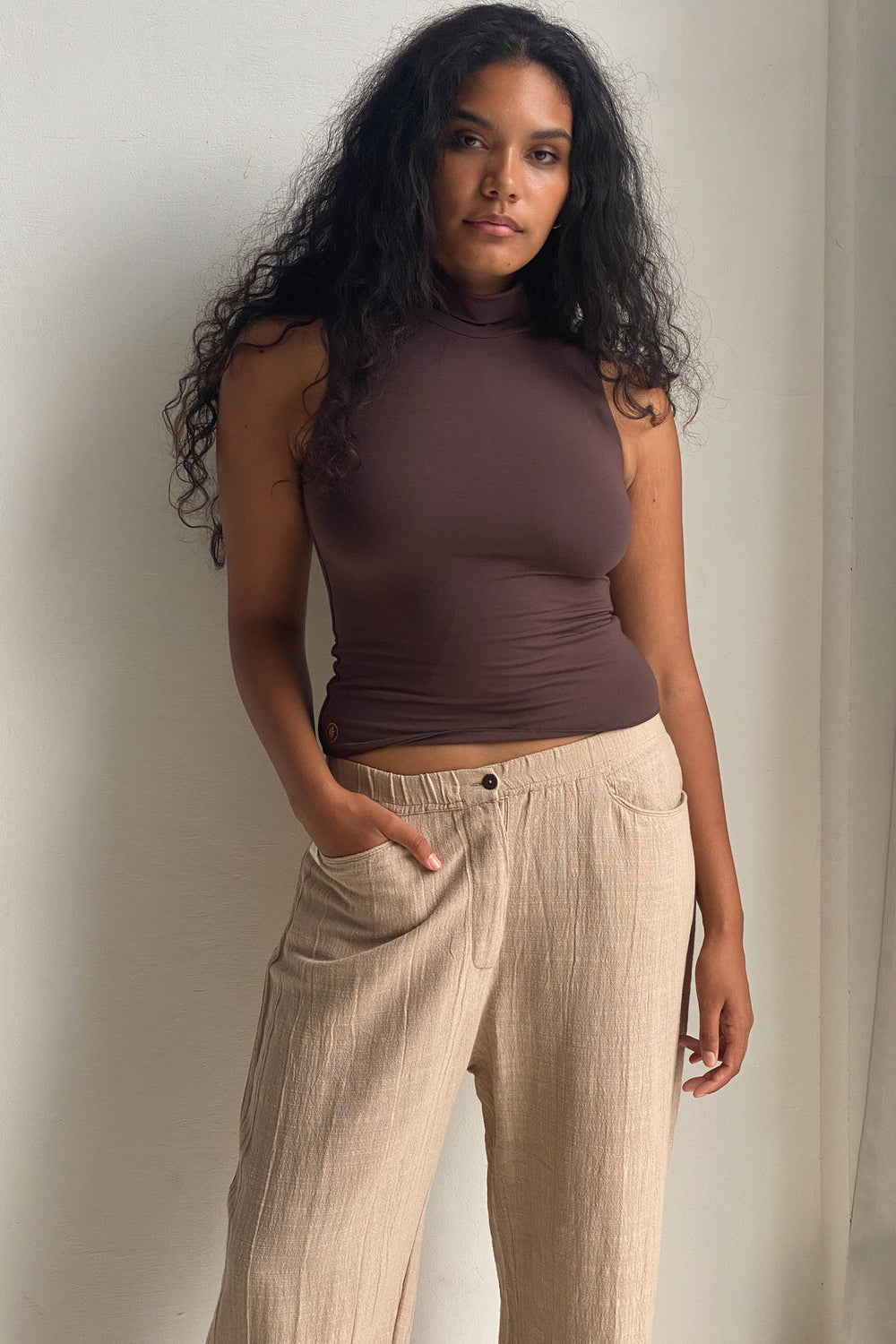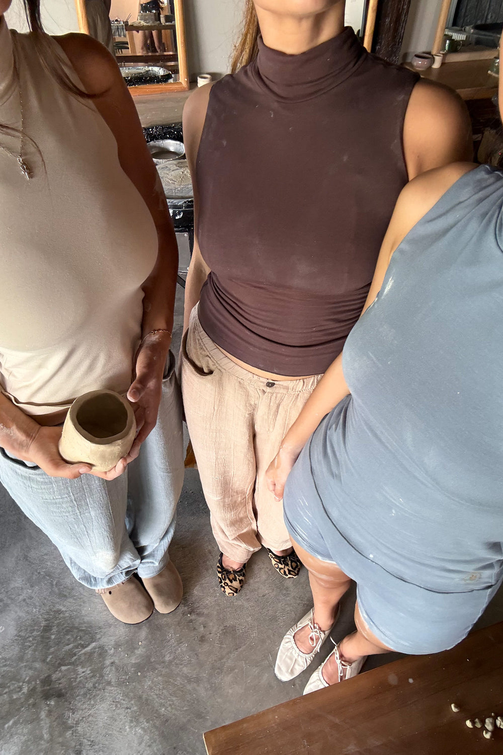 Hitomi shared the importance of creating pieces that wouldn’t anchor her to one aesthetic and would allow her to move through all her different archetypes – so we designed the Ritual Top to honor this need for versatility. It features a modern and flattering high neck top for all of your daily rituals, no matter the season. This piece can be easily styled with every alter ego; pair with the Devotion Pants for a more adventure-ready look, or a low waist skirt for a little romance.